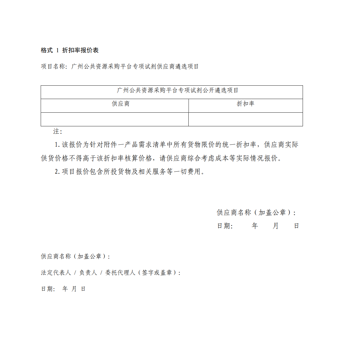 (二)报价方式:本项目以响应折扣率方式进行报价,本项目的所有货物均适用于同一个响应折扣率。响应折扣率必须为固定报价(□□.□□%),不接受区间报价(例如□□.□□%~□□.□□%),在0%-100%范围内取值(响应折扣率不能等于0%),若报价超出此范围则报价无效。各种货物的采购数量按采购人实际需求。